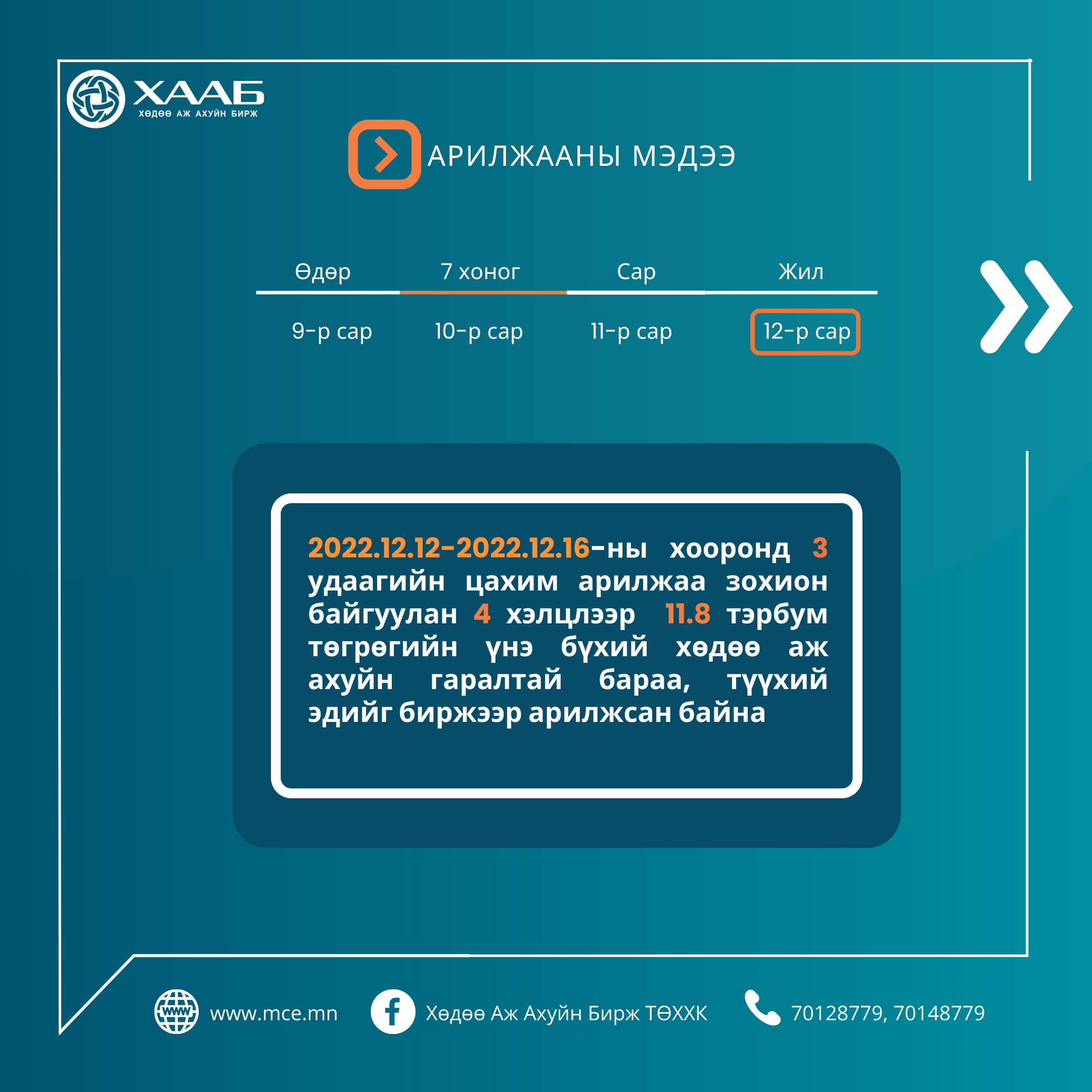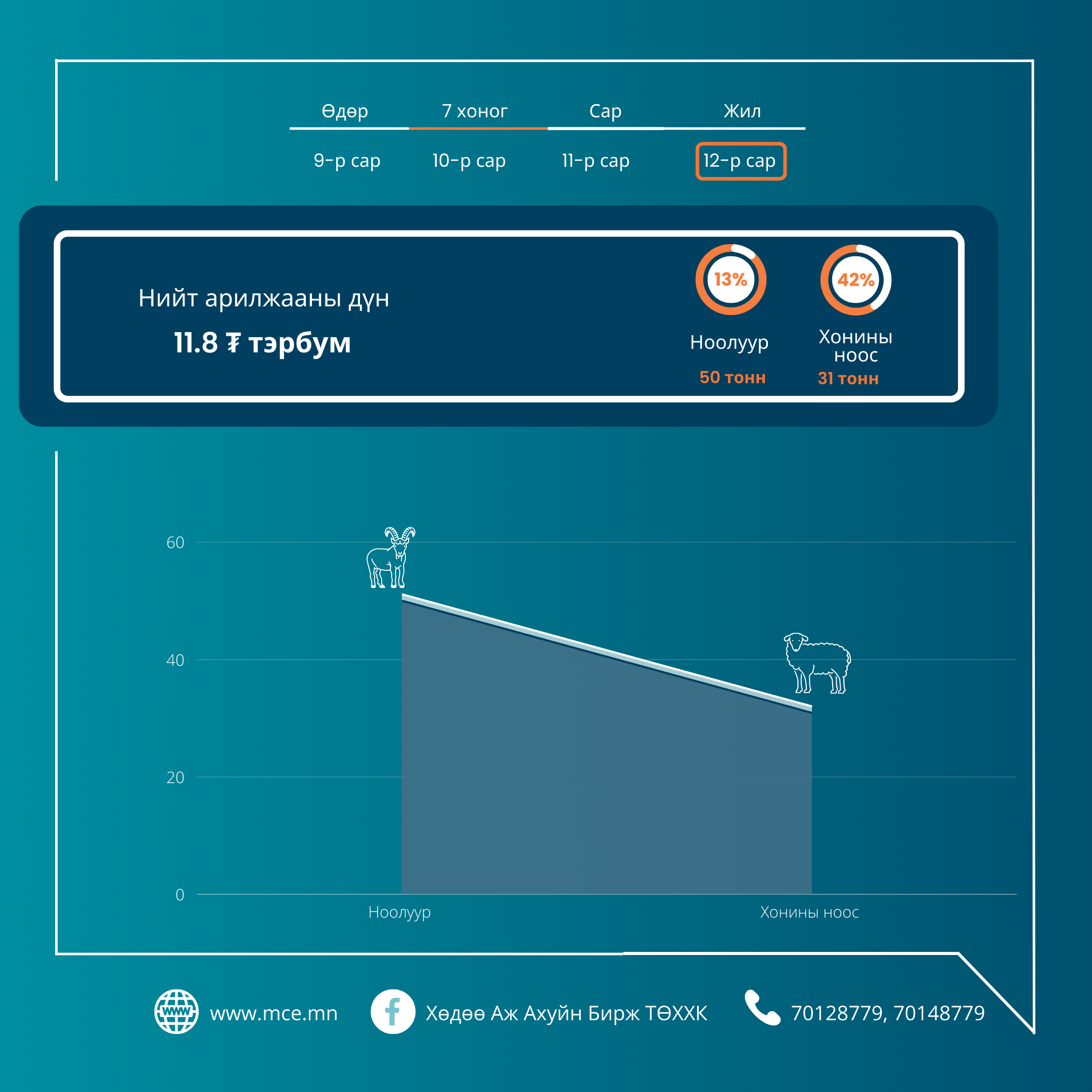 2022 оны 12 дугаар сарын 12-ooс 12 дугаар сарын 16-ны хооронд хөдөө аж ахуйн биржээр нийт 3 удаагийн арилжаа зохион байгуулагдаж 4 хэлцлээр 11.8 тэрбум төгрөгийн үнэ бүхий бараа түүхий эд болох 50 тонн ноолуур, 3.1 тонн хонины ноос тус тус арилжсан байна.