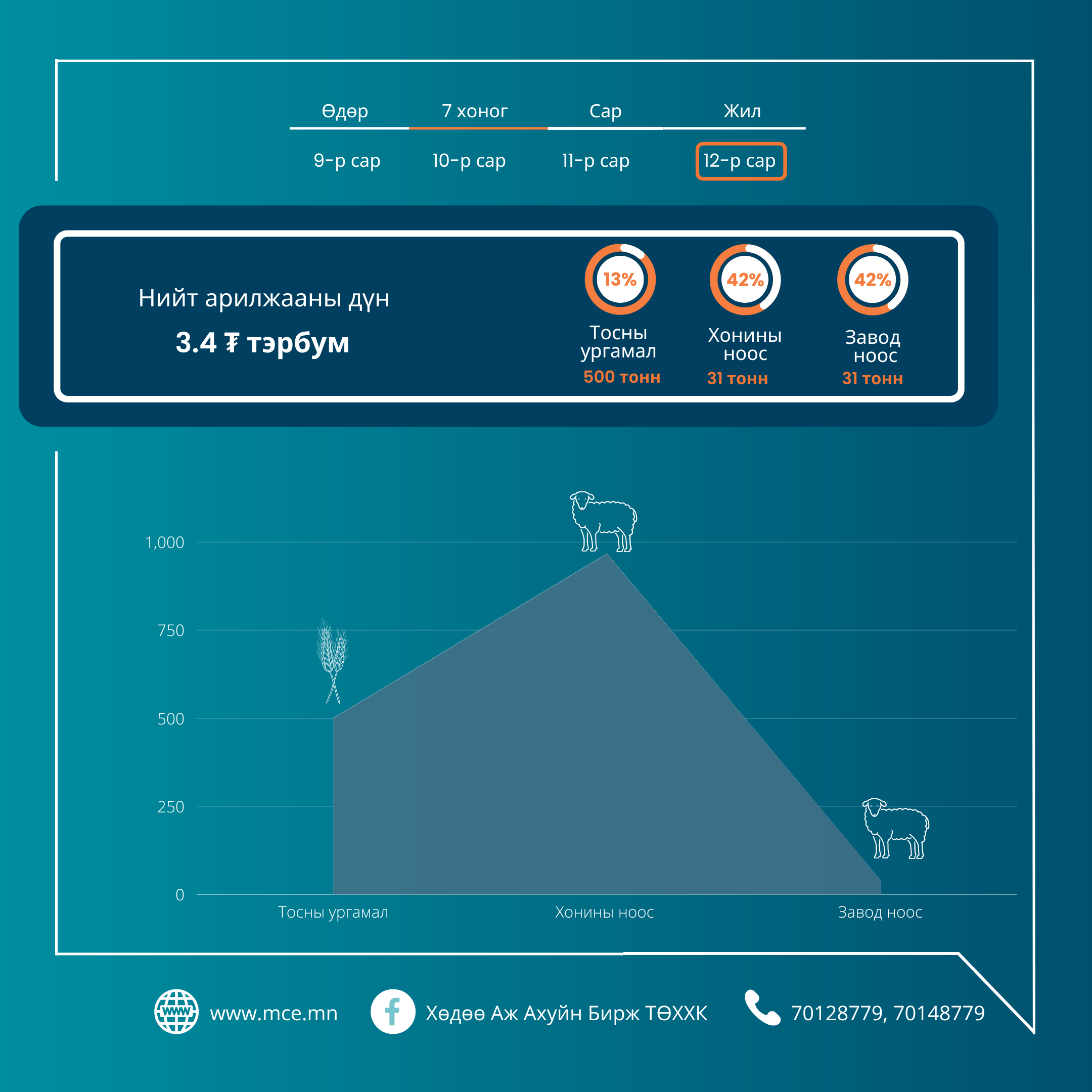 2022 оны 12 дугаар сарын 19-өөс 12 дугаар сарын 23-ны хооронд хөдөө аж ахуйн биржээр нийт 3 удаагийн арилжаа зохион байгуулагдаж 25 хэлцлээр 3.4 тэрбум төгрөгийн үнэ бүхий бараа түүхий эд болох 500 тонн тосны ургамал, 967.2 тонн хонины ноос, 41.1 тонн завод ноос тус тус арилжсан байна.