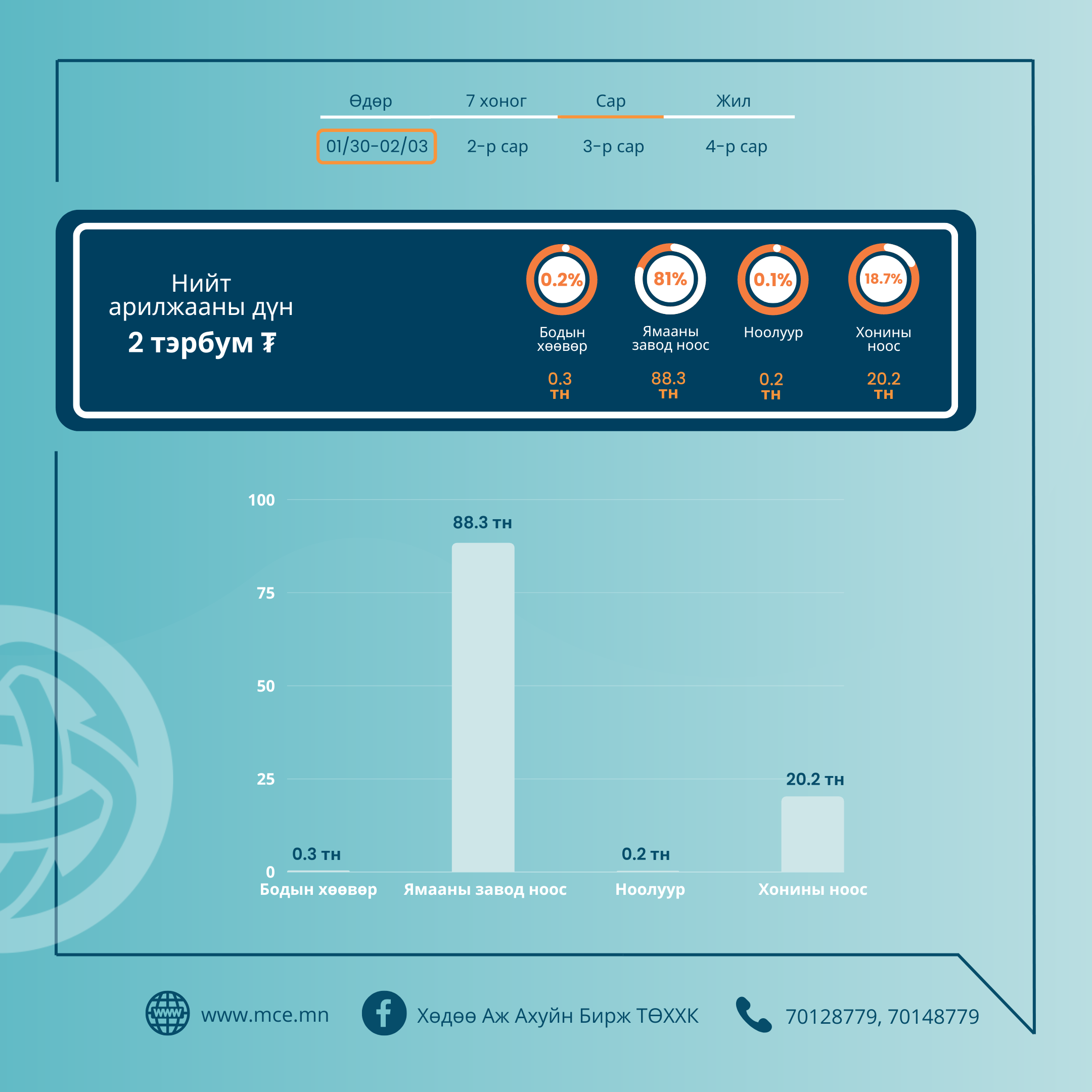 2023 оны 01 дүгээр сарын 30-aaс 02 дугаар сарын 03-ны хооронд хөдөө аж ахуйн биржээр нийт 3 удаагийн арилжаа зохион байгуулагдаж 23 хэлцлээр 2 тэрбум төгрөгийн үнэ бүхий бараа түүхий эд болох 0.2 тонн ноолуур, 88.3 тонн ямааны завод ноос, 20.2 тоннхонины ноос, 0.3 тонн бодын хөөвөр тус тус арилжсан байна.