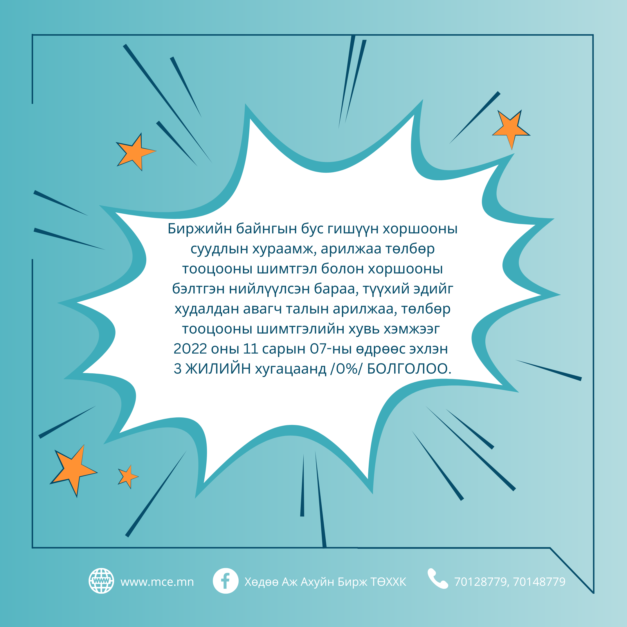 Хоршооны үйл ажиллагааг дэмжих ажлын хүрээнд 2022 оны 10 дугаар сарын 27-ны өдрийн ТУЗ-ын 10-р тогтоолоор биржийн байнгын бус гишүүн хоршооны суудлын хураамж, арилжаа, төлбөр тооцооны шимтгэл болон хоршооны бэлтгэн нийлүүлсэн бараа, түүхий эдийг худалдан авагч талын арилжаа, төлбөр тооцооны шимтгэлийн хувь хэмжээг тэглэлээ. Уг тогтоолын хэрэгжилт нь 3 жилийн хугацаанд үргэлжлэх юм.